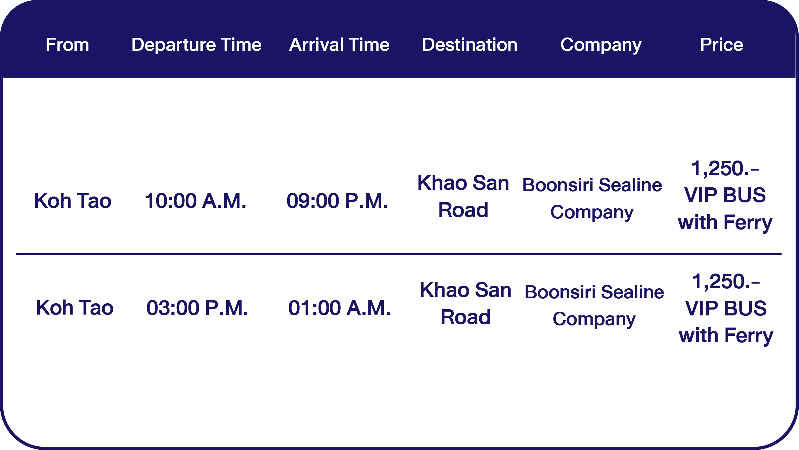 Boonsiri Sealine Office, Khao San Road, Soi Kraisi, provides bus services from Bangkok to Koh Tao, Koh Phangan and Koh Samui.