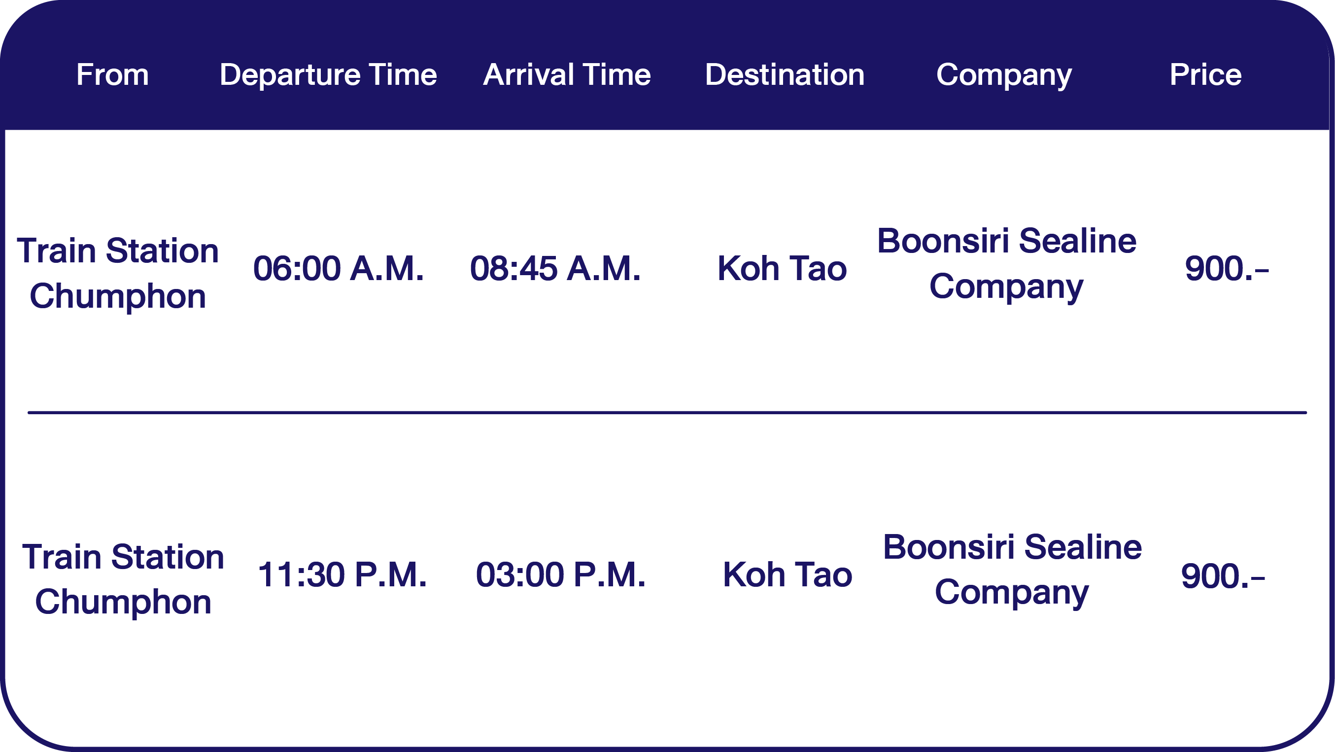 - The ferry departs from the Boonsiri Chumphon office at 6:45 AM, arriving on Koh Tao at 8:45 AM. The second ferry departs at 1:00 PM, arriving on Koh Tao at 3:00 PM.