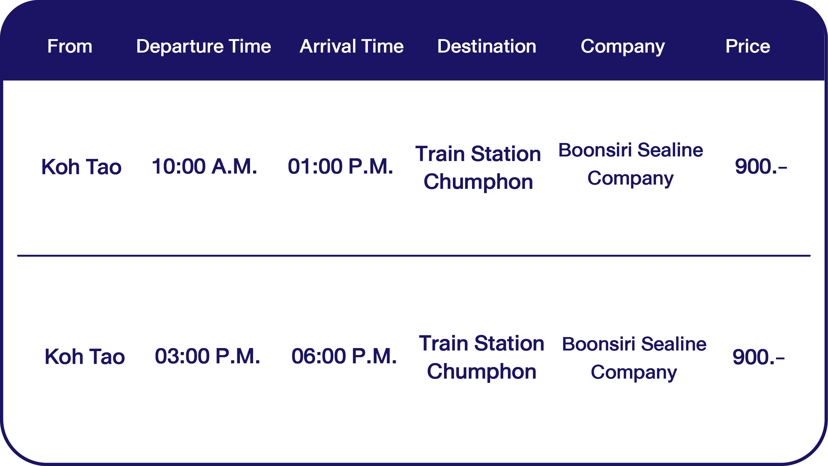 You can also purchase tickets and a pick-up service from Chumphon Train Station in advance. A Boonsiri Sealine van will be waiting in front of Chumphon Train Station.