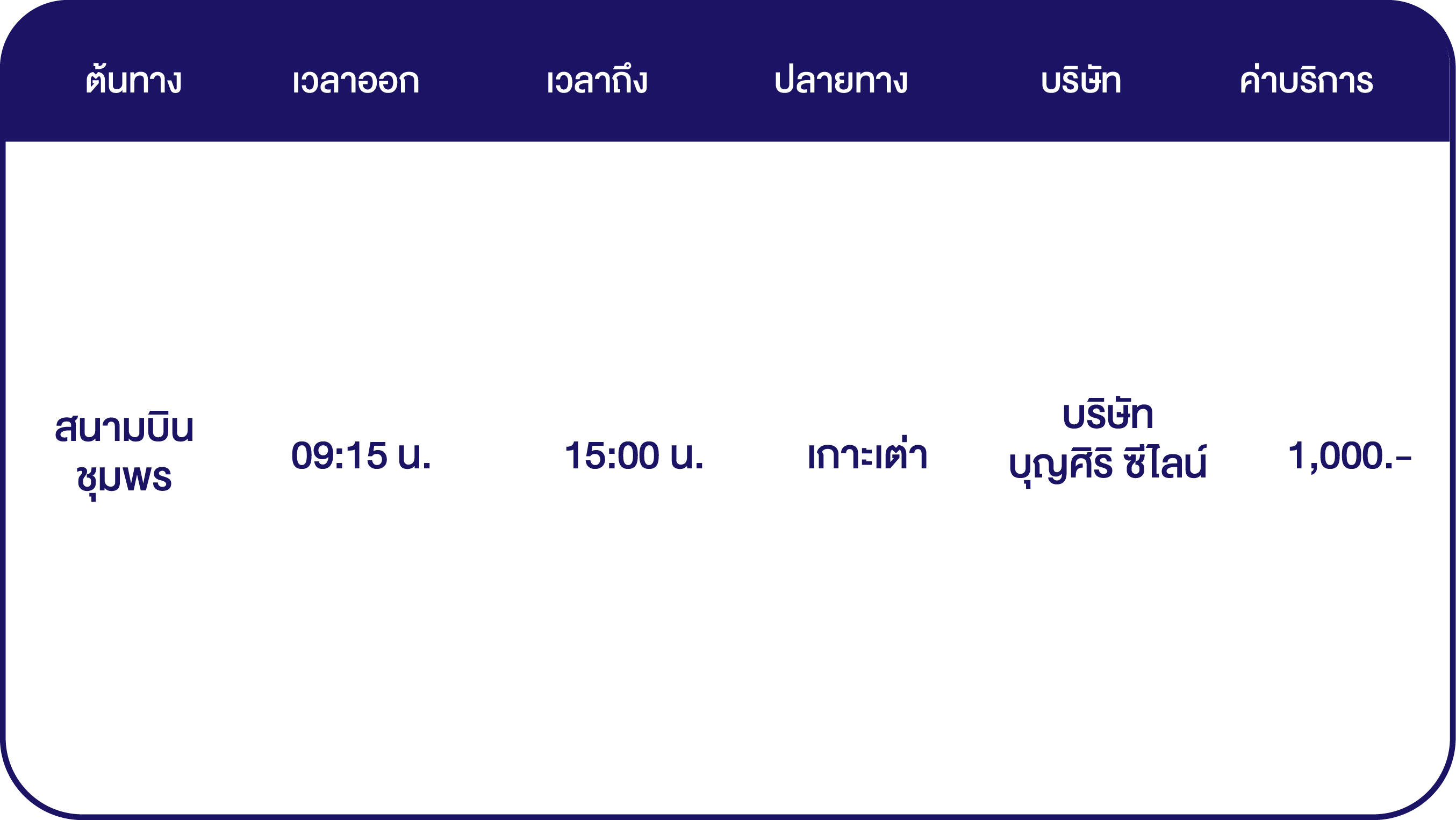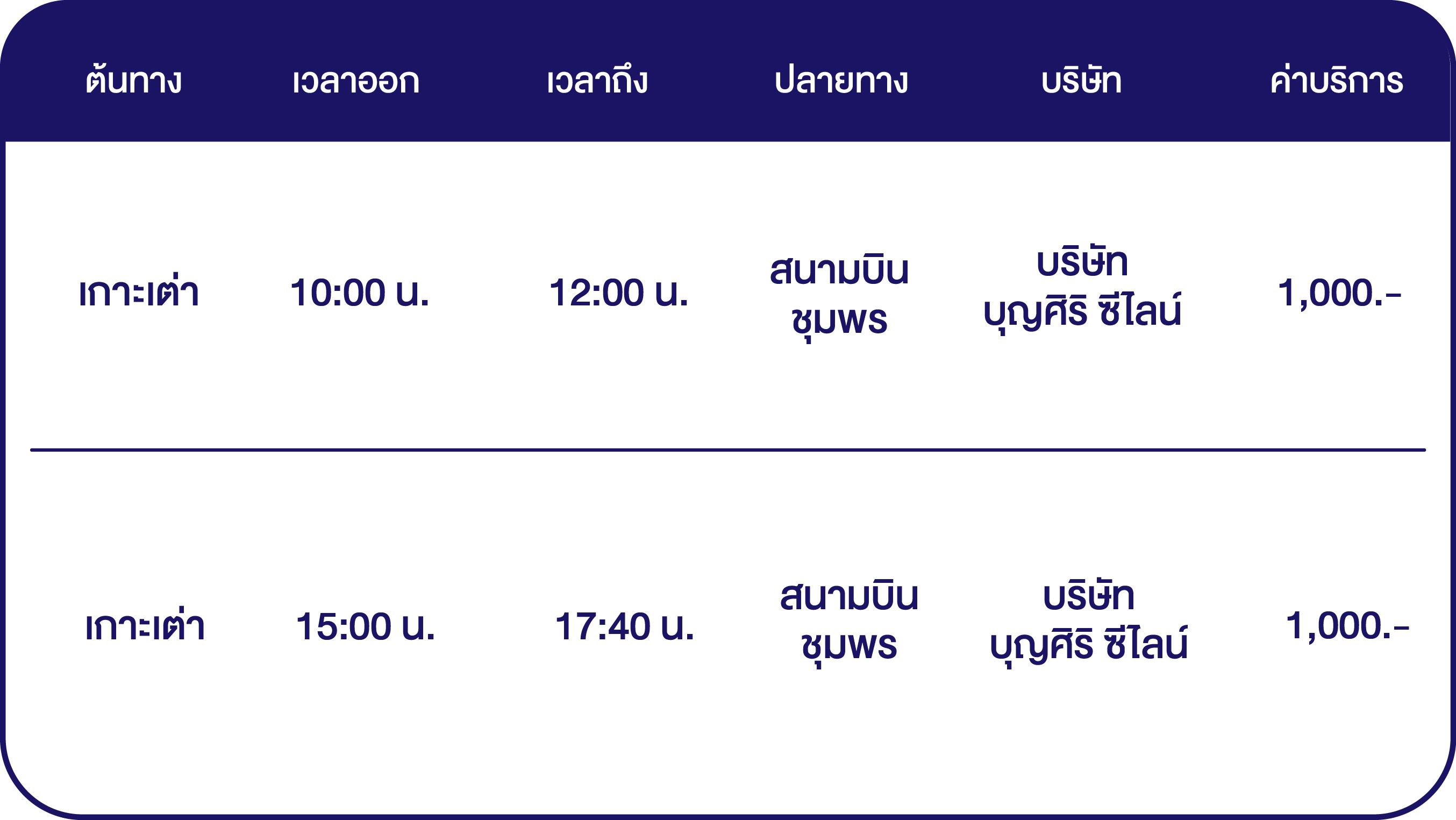 - รถตู้รับสนามบินชุมพร ออกเดินทางจากสนามบินชุมพร ไปยังท่าเรือบุญศิริสาขาชุมพร ใช้เวลาประมาณ 40 นาที